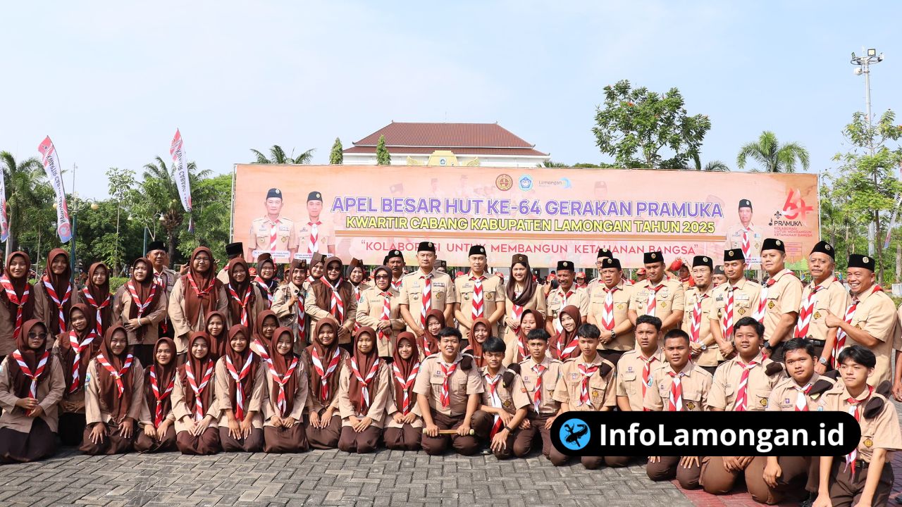 Infolamongan.id – Kabupaten Lamongan memperingati Hari Ulang Tahun (HUT) ke-64 Gerakan Pramuka dengan menggelar Apel Besar yang berlangsung khidmat di Alun-Alun Kabupaten Lamongan, Kamis (14/08/2025) pagi. Kegiatan yang mengusung tema “Kolaborasi Untuk Membangun Ketahanan Bangsa” ini dihadiri oleh seluruh unsur Forkopimda Lamongan, termasuk Kapolres Lamongan AKBP Agus Dwi Suryanto, S.I.K., M.H. dan Bupati Lamongan selaku Ketua Majelis Pembimbing Cabang.