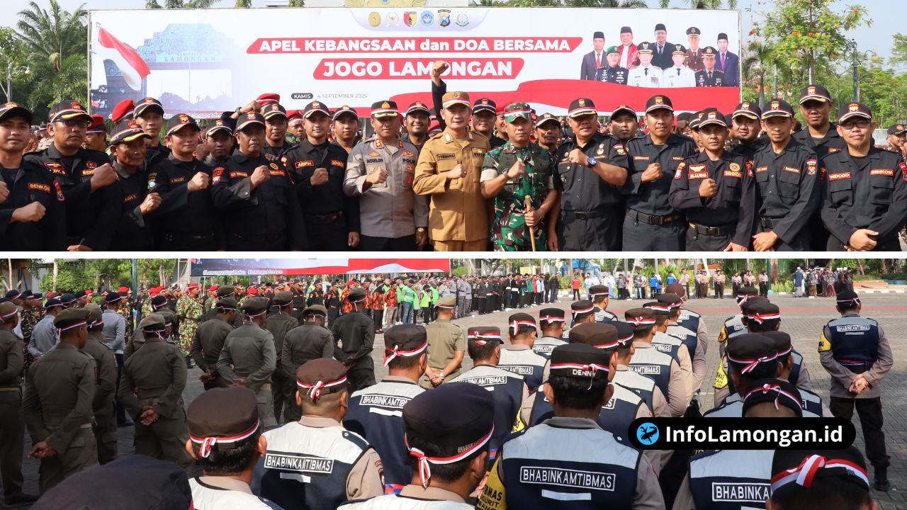 infolamongan.id – Polres Lamongan menggelar Apel Kebangsaan dan Doa Bersama Jogo Lamongan 2025 pada Kamis pagi (04/09/2025) di Alun-Alun Kabupaten Lamongan. Kegiatan ini menjadi momentum strategis untuk mempererat persatuan dan meneguhkan komitmen bersama menjaga keamanan dan ketertiban di Kabupaten Lamongan.