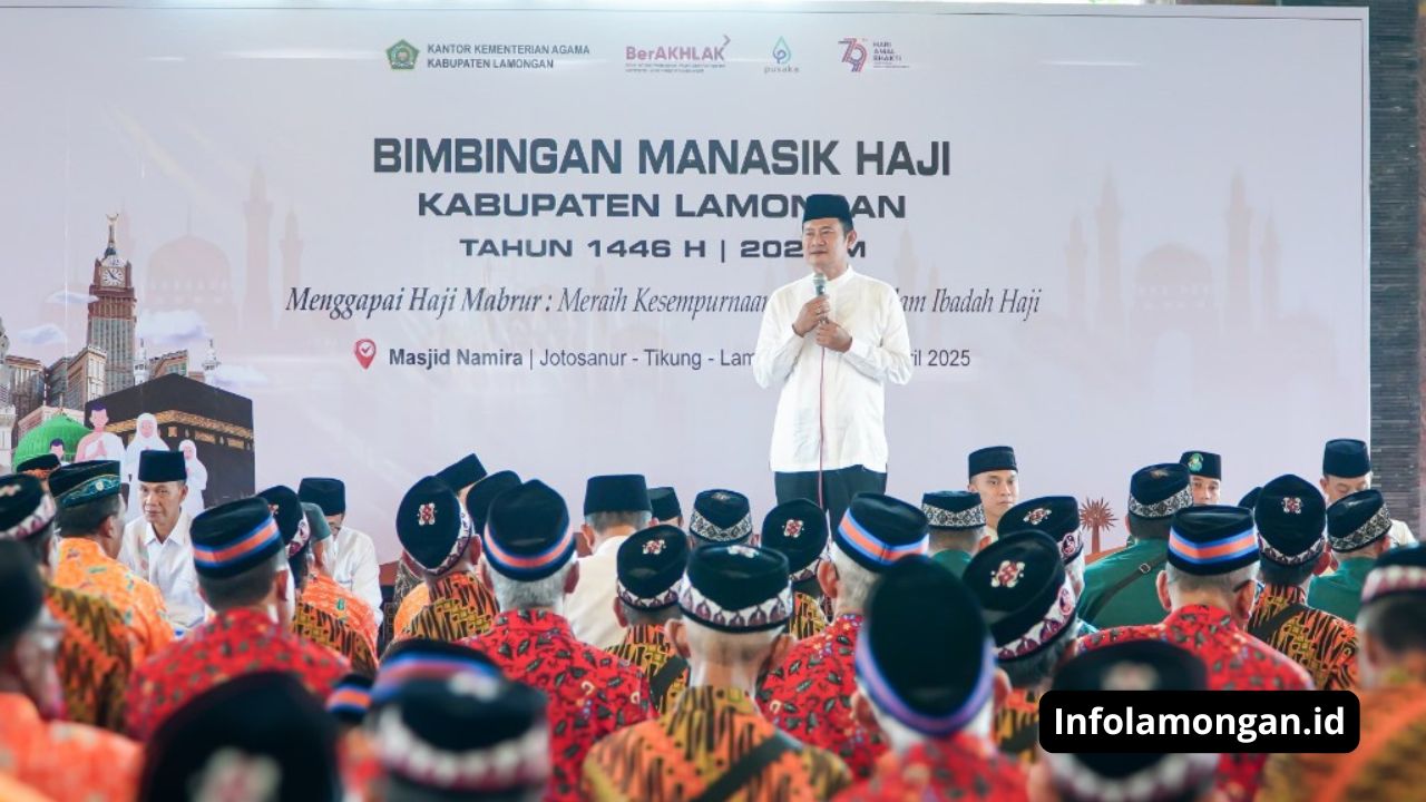 Infolamongan.id – Bupati Lamongan Yuhronur Efendi secara resmi membuka kegiatan Bimbingan Manasik Haji Massal bagi Calon Jamaah Haji (CJH) Kabupaten Lamongan tahun 1446 H / 2025 M, yang dilangsungkan di Masjid Namira, Jumat (18/4/2025). Kegiatan ini diikuti oleh ratusan jamaah yang akan segera menunaikan rukun Islam kelima ke Tanah Suci.