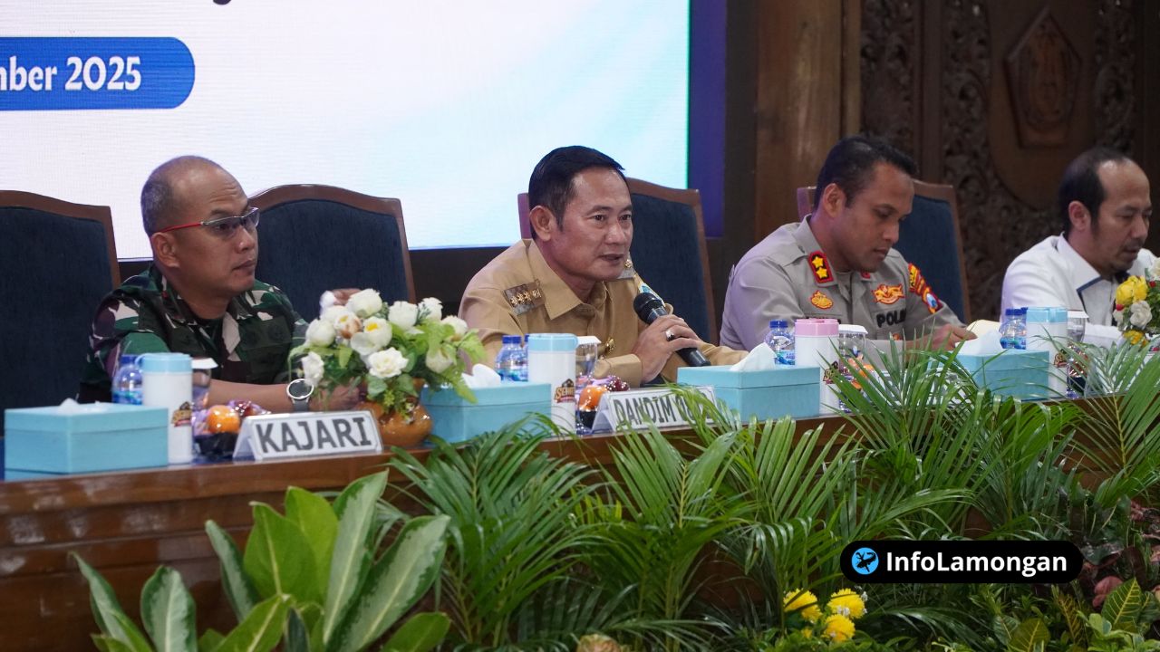 Infolamongan.com – Menyambut puncak mobilitas masyarakat dalam perayaan Natal 2025 dan Tahun Baru 2026 (Nataru), Pemerintah Kabupaten Lamongan melalui Forum Koordinasi Pimpinan Daerah (Forkopimda) menggelar rapat koordinasi (rakor) lintas sektoral. Pertemuan strategis yang digelar di Pendopo Lokatantra pada Senin (15/12/2025) sore ini, diprakarsai oleh Kepolisian Resor (Polres) Lamongan, bertujuan menyatukan visi dan langkah operasional seluruh pemangku kepentingan untuk memastikan pelaksanaan Nataru yang aman, tertib, dan lancar.