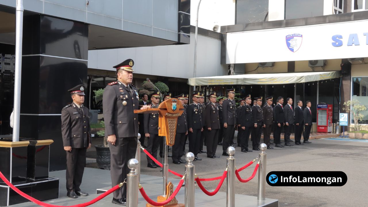 Suasana Lapangan Apel Polres Lamongan pagi itu dipenuhi oleh barisan rapi perwira, bintara, dan Pegawai Negeri Sipil (PNS) yang mengenakan pakaian dinas lengkap. Hadir dalam kesempatan tersebut Wakapolres Lamongan, seluruh Pejabat Utama (PJU) Polres Lamongan, para Kapolsek jajaran, serta perwakilan dari setiap satuan. Suasana khidmat dan penuh hormat menyelimuti setiap prosesi upacara.
