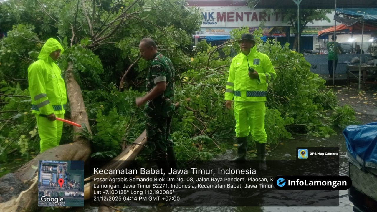 Infolamongan.com – Respons cepat dan kerja sama yang solid menjadi kunci dalam menangani dampak cuaca ekstrem yang kembali melanda wilayah Lamongan. Menyusul hujan deras disertai angin kencang yang menerjang Kecamatan Babat pada Minggu (21/12/2025) sore, Polsek Babat Polres Lamongan segera bergerak melakukan operasi evakuasi terhadap pohon tumbang yang menghambat akses jalan dan mengancam keselamatan masyarakat. Kejadian yang berlangsung antara pukul 15.30 hingga 16.30 WIB tersebut, berhasil ditangani dengan baik berkat koordinasi yang efektif antara aparat kepolisian, stakeholder terkait, dan warga sekitar.